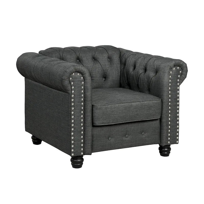 This charming armchair features button tufting details on the backrest and is available in your choice of beige or gray polyester fabric. Designed for both support and comfort, this sophisticated armchair boasts rolled arms, turned legs, and gleaming rivet detailing on the front of the arms.