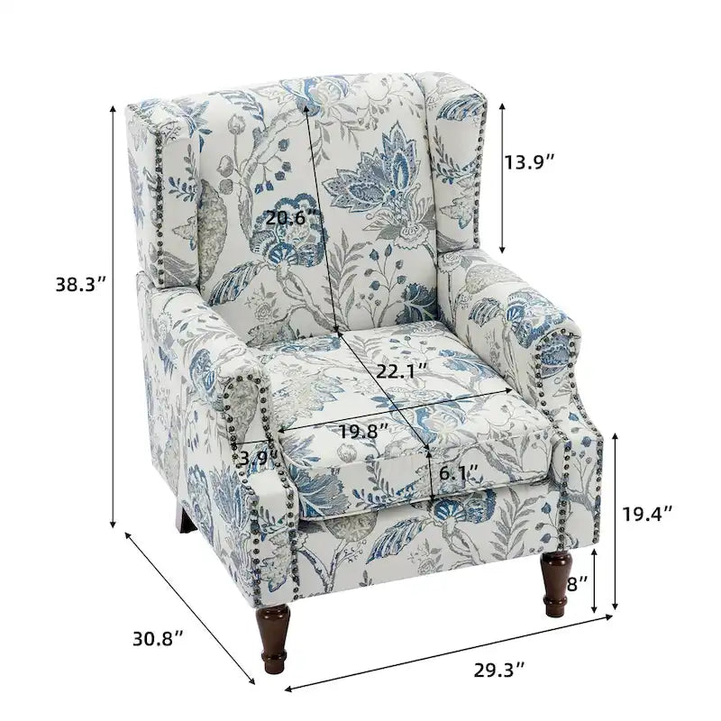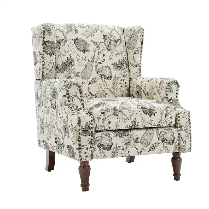 Elegant and inviting, our new armchair effortlessly combines style and practicality. Four sophisticated texture colors to suit any dcor. The embraced wingback design backrest provides luxurious side support, and the robust construction ensures long-lasting comfort. Adorned with exquisite floral fabric, this chair boasts a high color fastness, resisting fading and maintaining its beauty. Classic wooden legs with brass nailhead trim complete its refined look. A truly graceful addition to any space, offering both beauty and function.