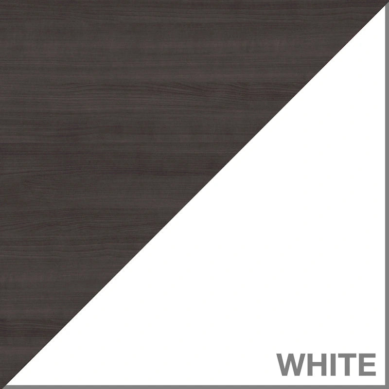 The corner desk includes a pull-out keyboard/laptop tray that can be installed on either side for personalized configuration.