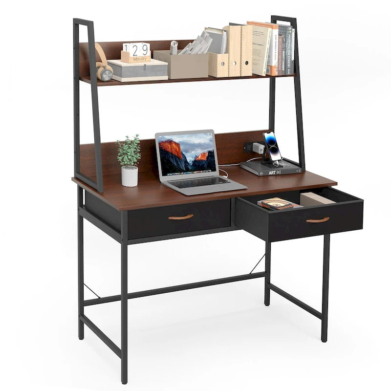 Computer Desk with Power Outlet, USB Ports & Bookshelf, 2 Fabric Drawers, 43.3" Wide, Home Office Study Desk