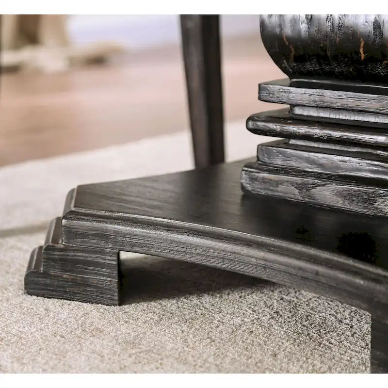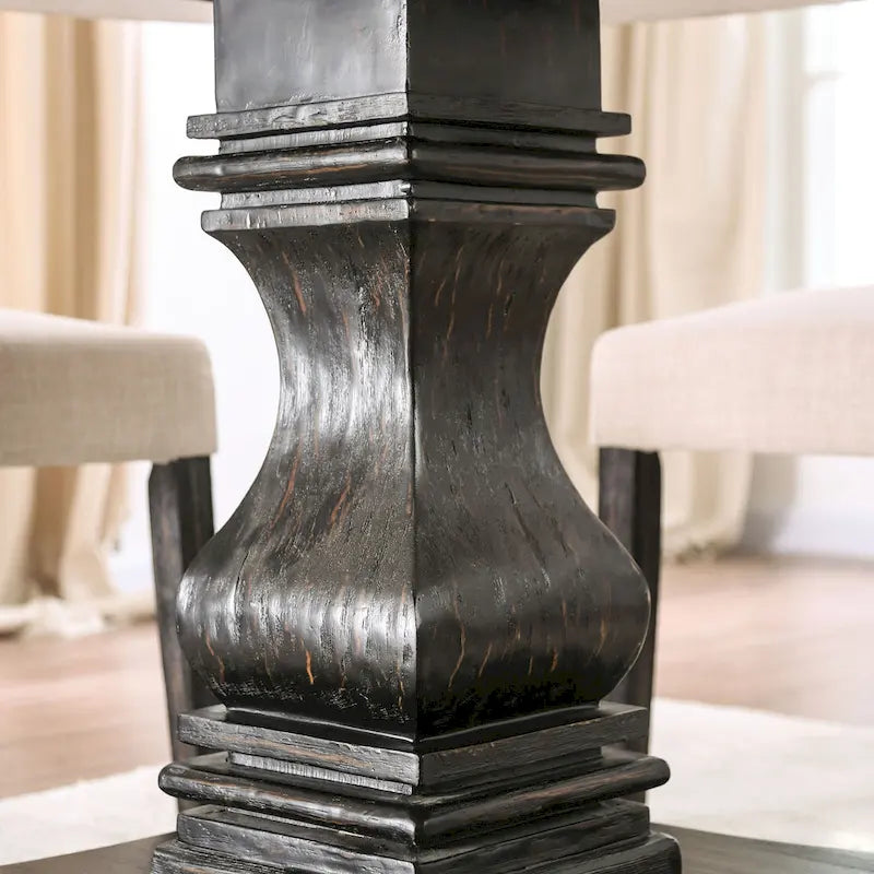 This five-piece dining set, with its charming country style, is perfect for intimate dinners or game nights, exuding elegant taste. The smooth white marble tabletop is paired with an antique black base, and the round pedestal table creates a sophisticated ambiance. Carved geometric patterns add a touch of whimsy, bringing a classic yet unique exotic flair. The comfortable upholstered chairs feature soft linen fabric and delicate button tufting for ultimate comfort.