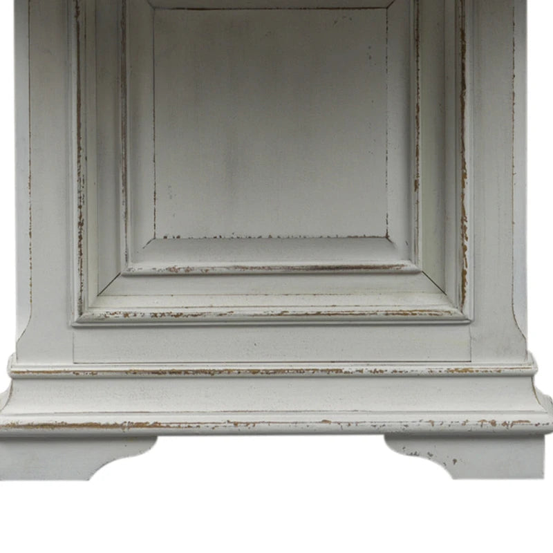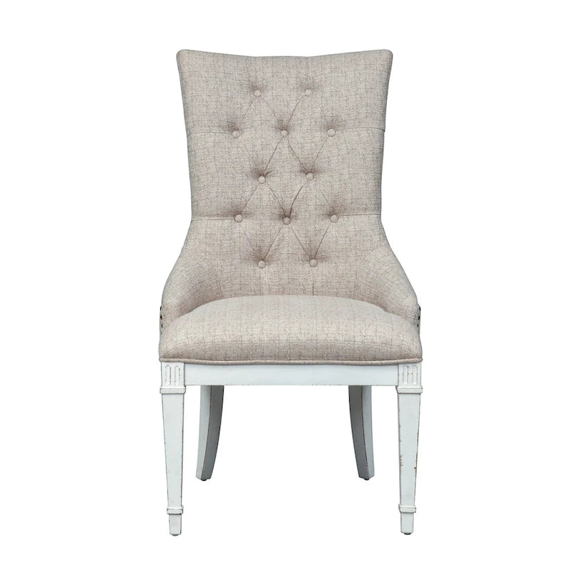Creating an elegant style has never been easier. This furniture set is crafted from solid poplar and rubberwood, featuring cathedral white oak and birch veneers, finished in an antique white with distressed and aged details, and a weathered brown tabletop with a white wash effect. This set includes a trestle dining table, four upholstered dining chairs, and two armchairs. The dining table features an exquisite veneer design with curved corners and grooved accents, and a raised panel base with a central support. The dining chairs are upholstered in chenille fabric with nailhead trim, tapered legs with grooved accents, and nylon glides to protect your floors. The armchairs are upholstered in button-tufted chenille fabric with nailhead trim, tapered legs with grooved accents, and nylon glides. Blending traditional European design elements, the Abbey Park collection brings a truly unique style to any living space.