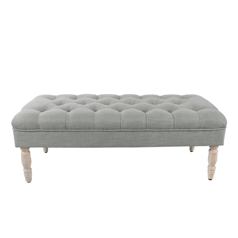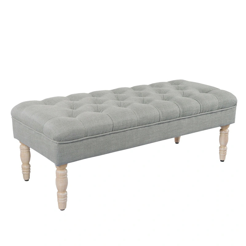 This classic tufted bench features a stylish upholstered top with deep button tufting and natural wood grain finished legs. This versatile upholstered bench is suitable for various uses throughout the home. Use it as a bed-end bench, dining bench, entryway bench, or even as a footrest with a coffee table. Easy to assemble and maintain, spot cleaning is recommended when needed.