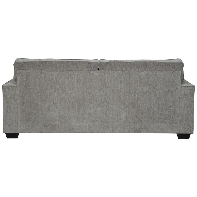 If style is the question, then this striking sofa is the answer. Sporting clean lines and sleek track arms, the decidedly contemporary profile is enhanced with plump cushioning and a chenille-feel upholstery that's so pleasing to the touch. Sure to play well with so many color schemes, this sofa in richly neutral alloy includes a pair of understated floral pattern pillows for fashionably fresh appeal.