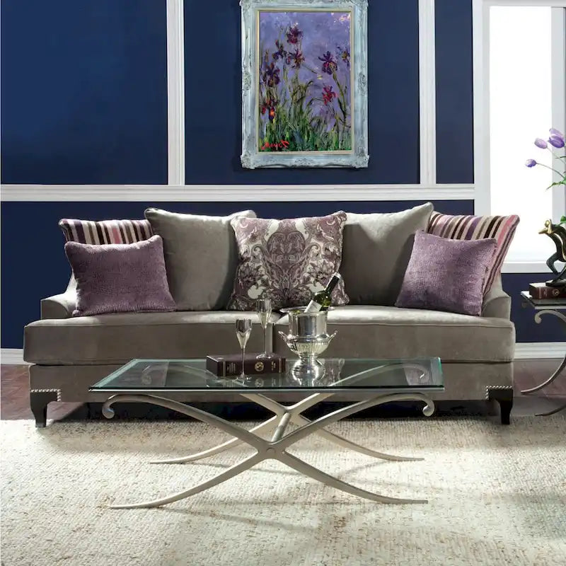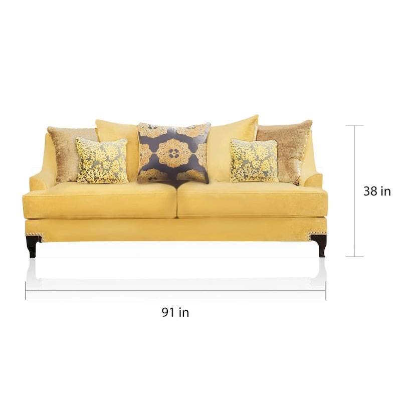 This sofa boasts a buttery-smooth, luxurious look that will add captivating charm and elegant style to your living room. Soft velvet fabric envelops thick foam-filled cushions, providing exceptional comfort and ultimate support. Removable cushions (some with a floral pattern) offer extra back support and comfort, adding a bold and eye-catching accent to the design.