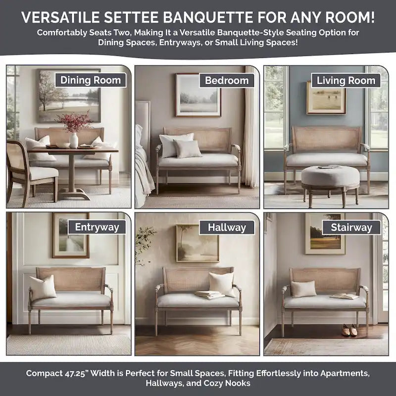 Breezy, effortless beauty is on display with this posh and pretty settee. The solid wood construction makes for a lasting piece, and the polyester and rattan back provide inviting and relaxing comfort. Curate a welcoming and comfortable space in your home with the natural look of this settee.