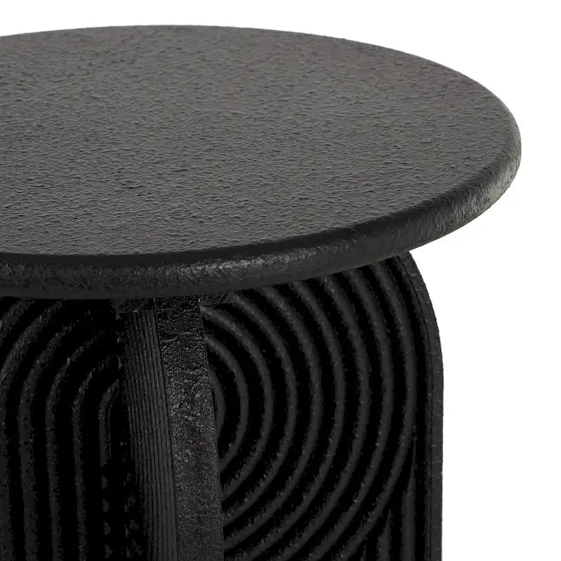 - Round table set boasts a rich black color, enhanced by a sandstone inspired finish that exudes an air of elegance and sophistication