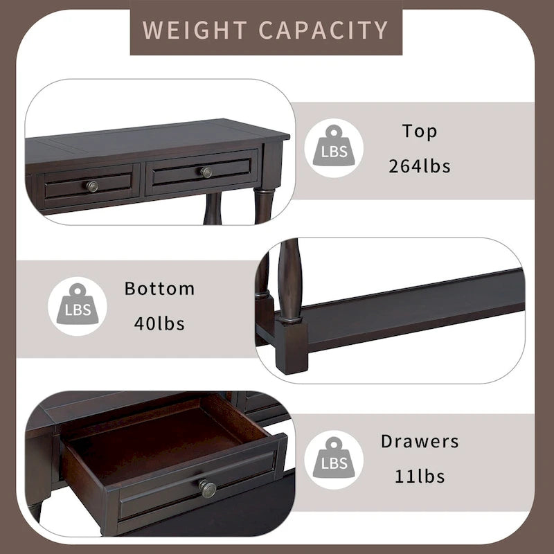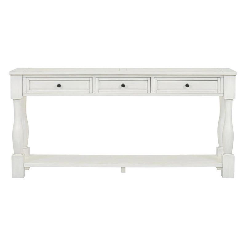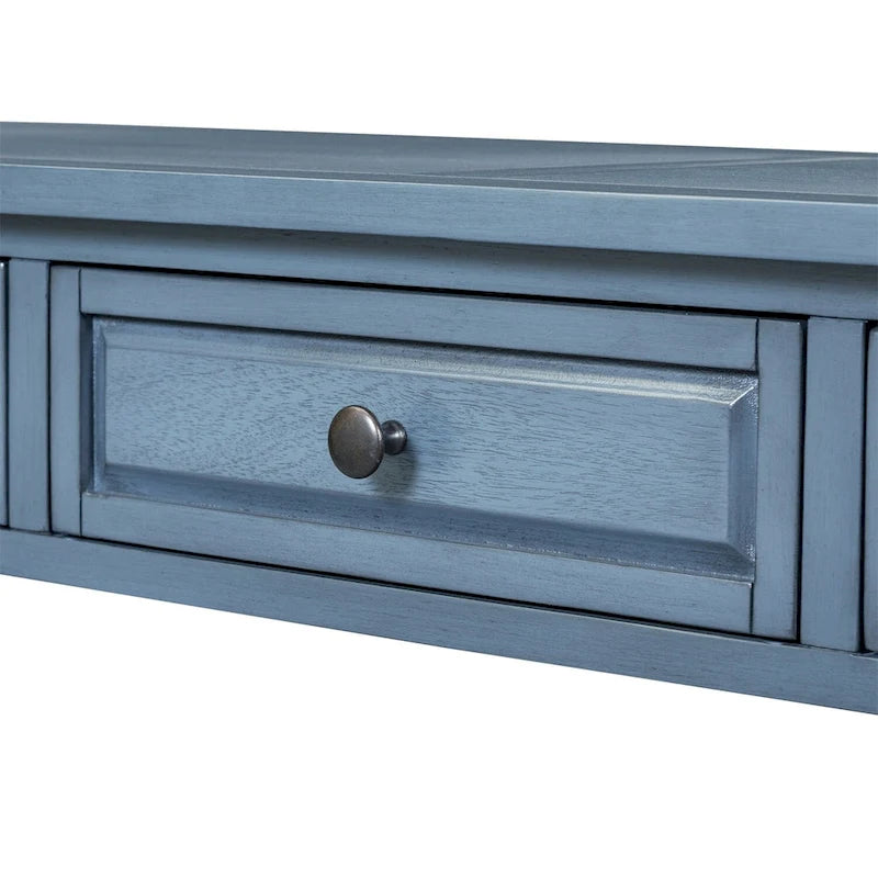 Mera 64-inch thickened long console table with drawers and shelves.
