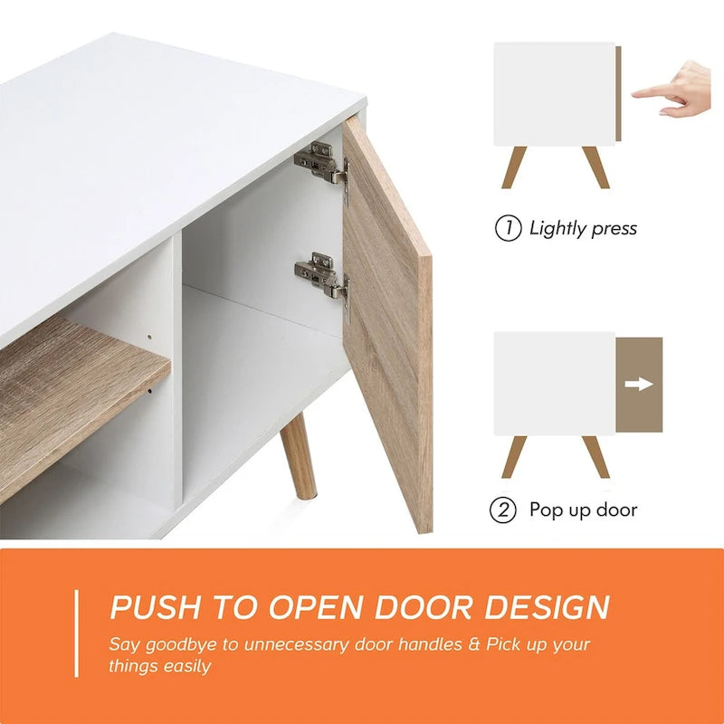 - Multifunctional Storage & Adjustable Shelf This modern entertainment center features 2-tier open shelves and push-to-open doors help make your home feel lived in and neat.Adjustable-height shelves provide large and useful storage capacity space.