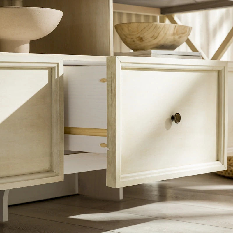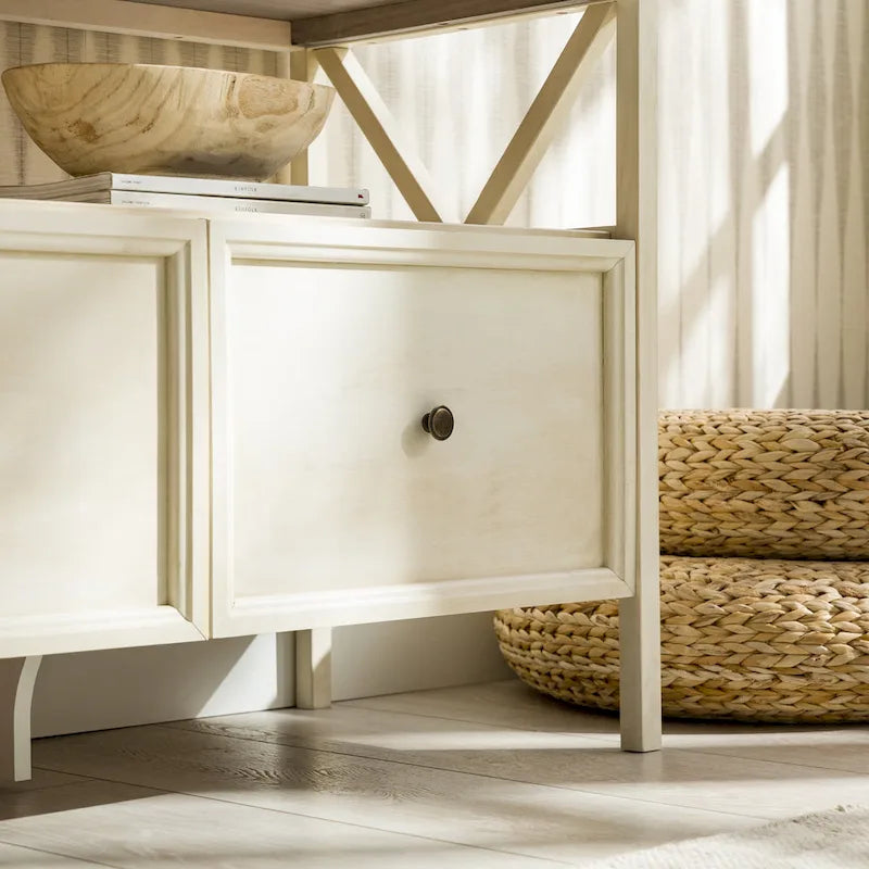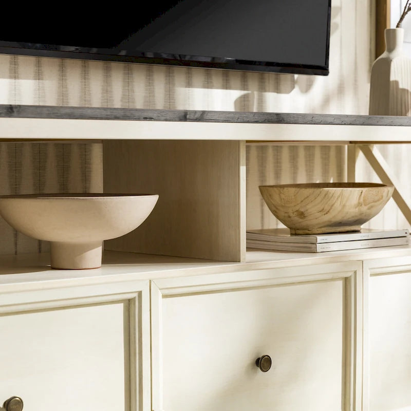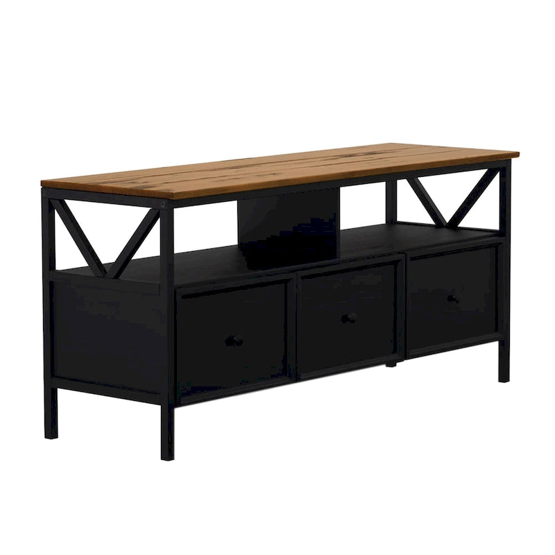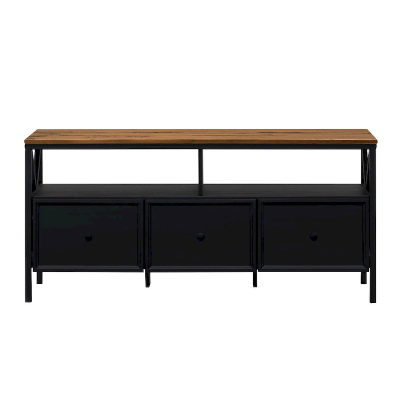 Two-toned, rustic and distressed: this 60-inch TV console is the versatile piece to finish off your TV room, dining area, or home office. Featuring divided open cubbies and three spacious drawers, your media, work-from-home essentials or dinnerware will be stylishly on display or hidden away. Crafted from solid wood responsibly sourced from renewable forests and warp-resistant MDF topped with a durable laminate finish, this TV stand is the easy, storage-savvy fix you've been looking for to tidy up your favorite space.