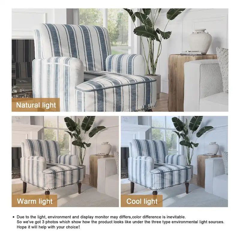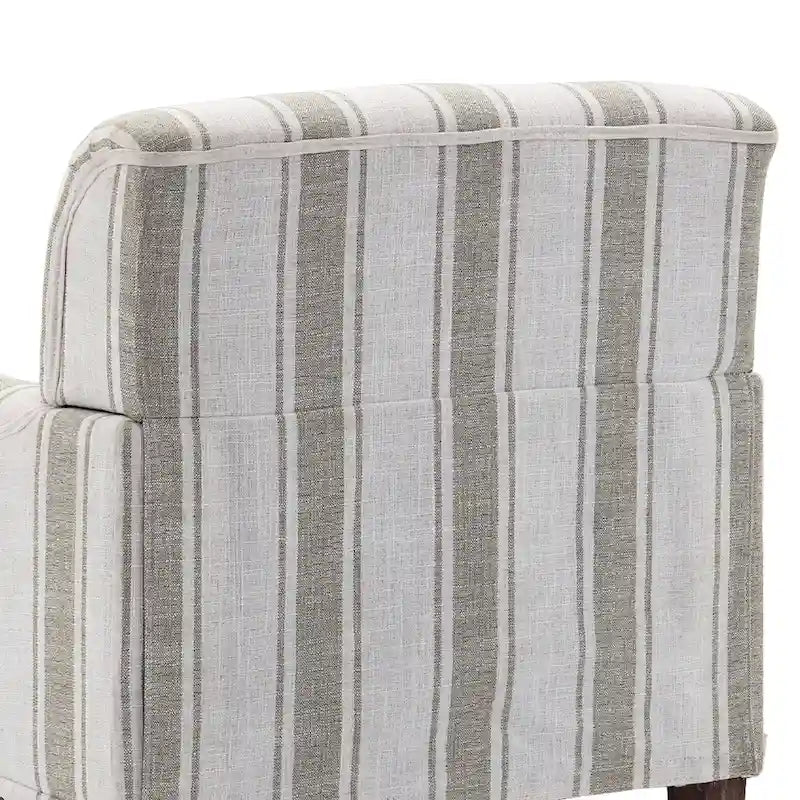 Looking for the perfect blend of farmhouse charm and classic elegance? Look no further! Our new armchair is here to steal the spotlight in your home. This beauty features a solid and manufactured wood frame, dressed up in chic striped linen-blend upholstery. The foam-filled back is like a cozy hug, and the vintage nail-head trim adds just the right amount of flair. Whether you're curling up with a book or hosting a cozy gathering, the high-density foam and built-in springs ensure you're sitting pretty. Ideal for your study, bedroom, or living room, this armchair is as versatile as it is stylish. Add this delightful piece to your space and let the compliments roll in.